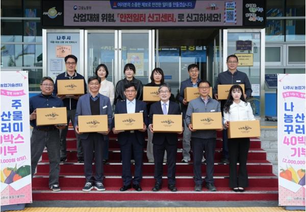 나주로컬푸드를 통해 마련한 돼지고기와 오리고기, 채소, 잡곡 등 약 200만 원 상당의 농축산물 꾸러미 40박스를 지역 푸드뱅크에 전달해 취약계층 지원과 지역 농산물 소비 촉진에 힘을 보탰다.