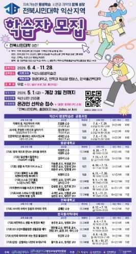 익산시는 오는 5월 1일부터 '2026년 전북시민대학 익산캠퍼스' 학습자를 모집한다고 29일 밝혔다.