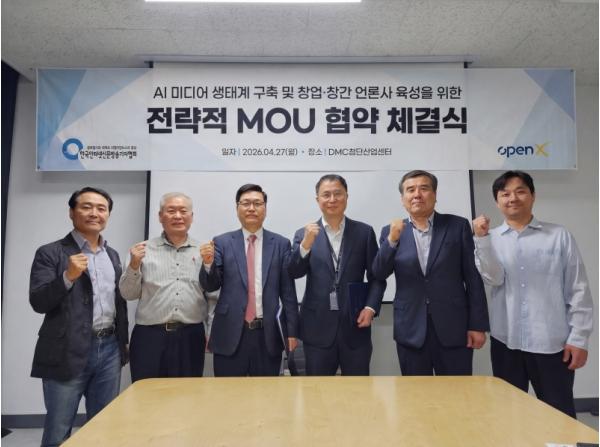 한국인터넷신문방송기자협회(회장 전병길, 이하 협회)와 오픈엑스(대표 김미진)는 지난 2026년 4월 27일 서울 상암동 DMC첨단산업센터에서 업무협약(MOU)을 체결하고, 제휴 언론사 육성과 건강한 미디어 생태계 강화를 위해 적극 협력하기로 뜻을 모았다.