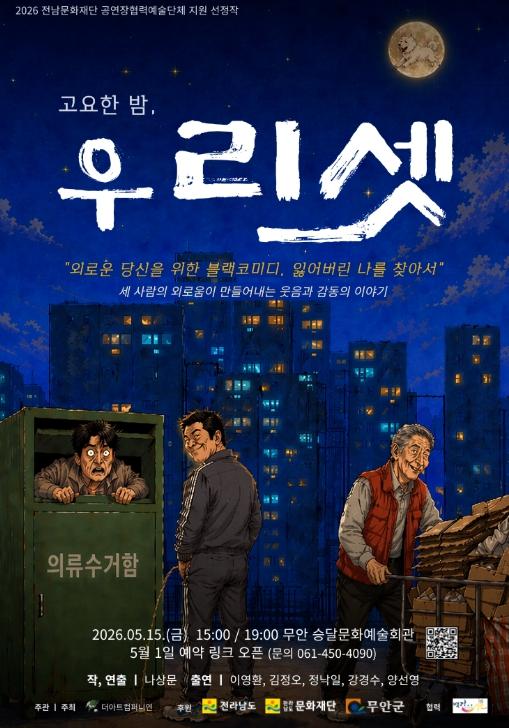 [중앙뉴스라인, 이상권기자] 무안군은 지역 공연단체 더아트컴퍼니 연이 전남문화재단의 ‘공연장 협력 예술단체 지원사업’에 선정됨에 따라, 그 첫 작품으로 휴먼 블랙코미디 연극 ‘고요한 밤, 우리 셋’을 오는 5월 15일 오후 3시와 오후 7시 승달문화예술회관 대공연장에서 선보인다고 밝혔다.